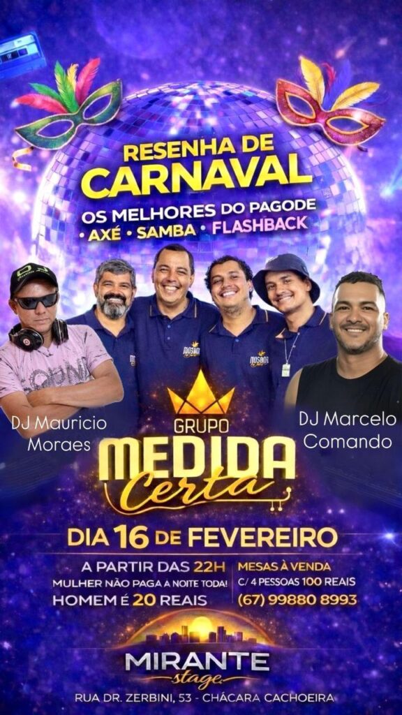 O Mirante Stage, localizado na Chácara Cachoeira, recebe no dia 16 de fevereiro, a partir das 22 horas, a Resenha de Carnaval, evento que promete agitar a noite campo-grandense com muita música, animação e clima carnavalesco.